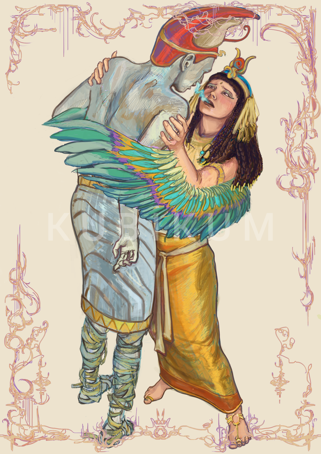 Ilustrácia inšpirovaná staroegyptskými pohrebnými textami, Knihou dýchania, a príbehom o bohyni Isis, ktorá vdýchla život svojmu mŕtvemu bratovi Osirisovi.