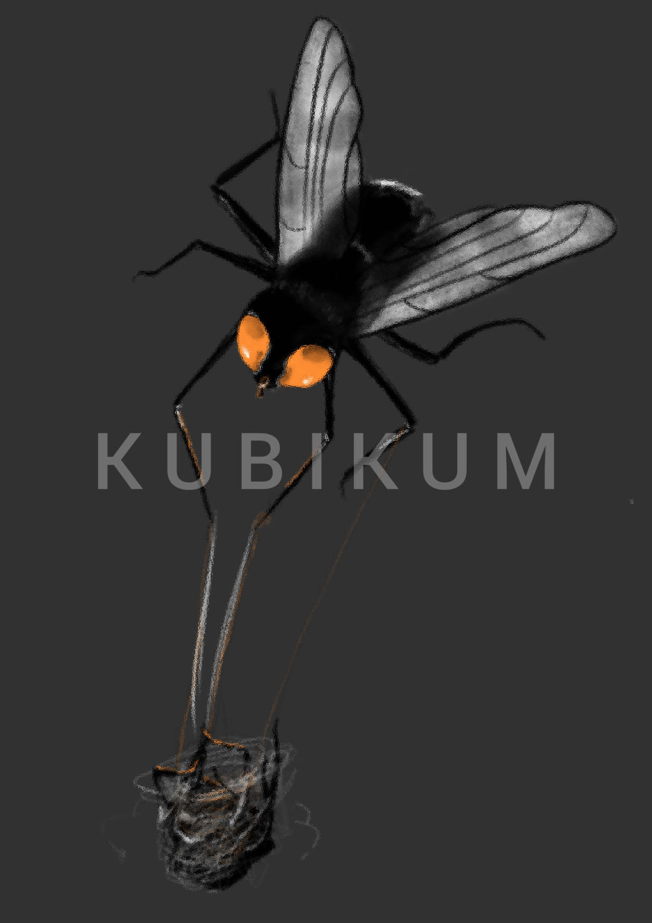 V diele MUCHACHA je paradox ten, že mucha je väčšinou obeť pavúka. Zamotá sa do pavučiny a pavúk ju zje. V tomto prípade je to opačne. Pavúk zamotaný v pavučine bojuje proti nej a mucha si pavúka zatiaľ priťahuje k sebe. Svietia jej oči na oranžovo kvôli kontrastu a obzvláštneniu. Chcela som aby pôsobila až strašidelne.