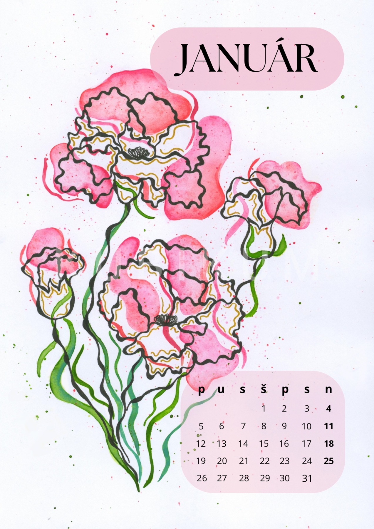 Kalendár som robila kombinovanou technikou. Použila som akvarelové farby a čierne fixky. Následne som prácu upravila vo photoshope.