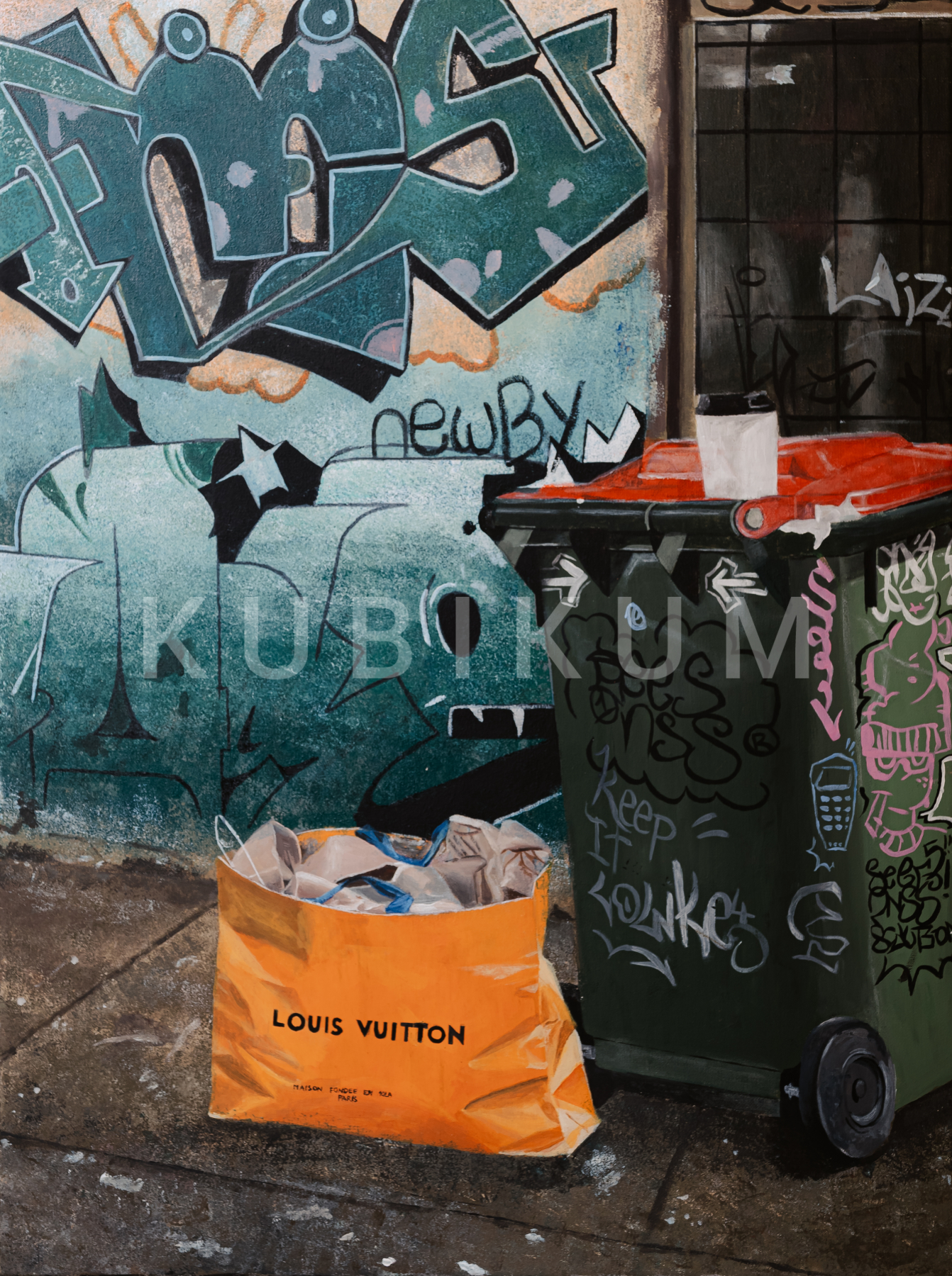 Luxusní taška stojí u popelnice a je plná odpadu. Lesklý materiál a dokonalé tvary kontrastují se špínou okolo. Krása a prestiž se tu střetávají s chaosem a odpadem. Paradox vzniká z nesouladu mezi tím, co očekáváme od luxusu, a tím, co taška skutečně obsahuje. Dílo provokuje otázkou, co je skutečná hodnota.