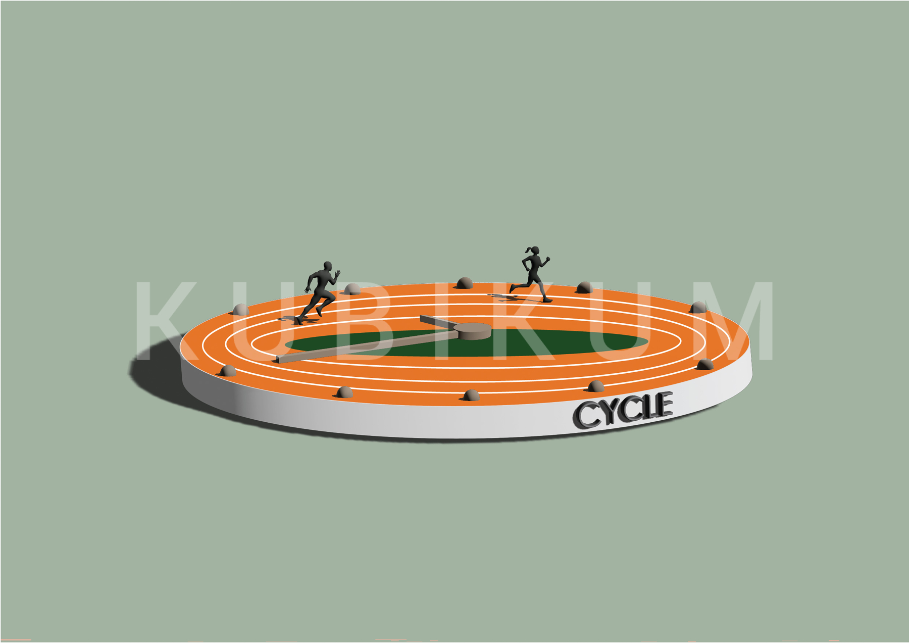 Ilustráciu som vytvorila s cieľom dosiahnuť moderný 3D efekt. Hodinový ciferník som premenila na bežeckú dráhu, ktorá symbolizuje rýchlosť a neúprosný cyklus času. Bežci predstavujú človeka utekajúceho pred dňami, ktoré neustále plynú. Kompozícia tak spája dynamiku pohybu s myšlienkou životného tempa.