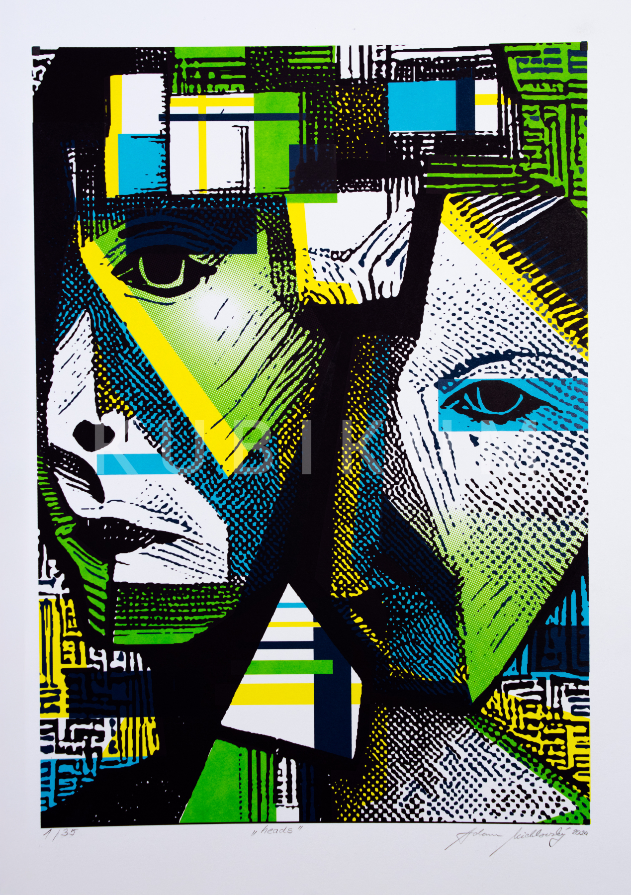 Toto dielo je päťfarebná sieťotlač s názvom Heads vol1. Zobrazuje dve tváre spracované v abstraktnej podobe. Dielo využíva výrazné geometrické tvary, šrafovanie a farebné plochy v kontrastných odtieňoch.