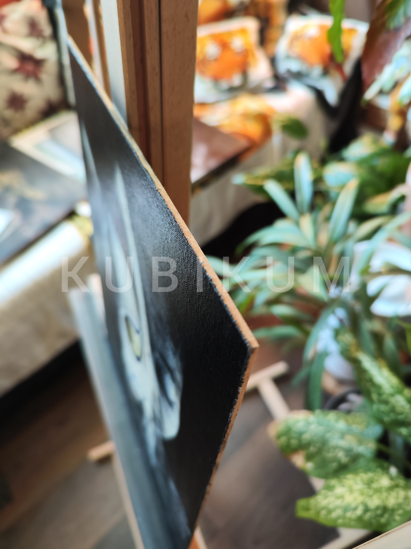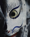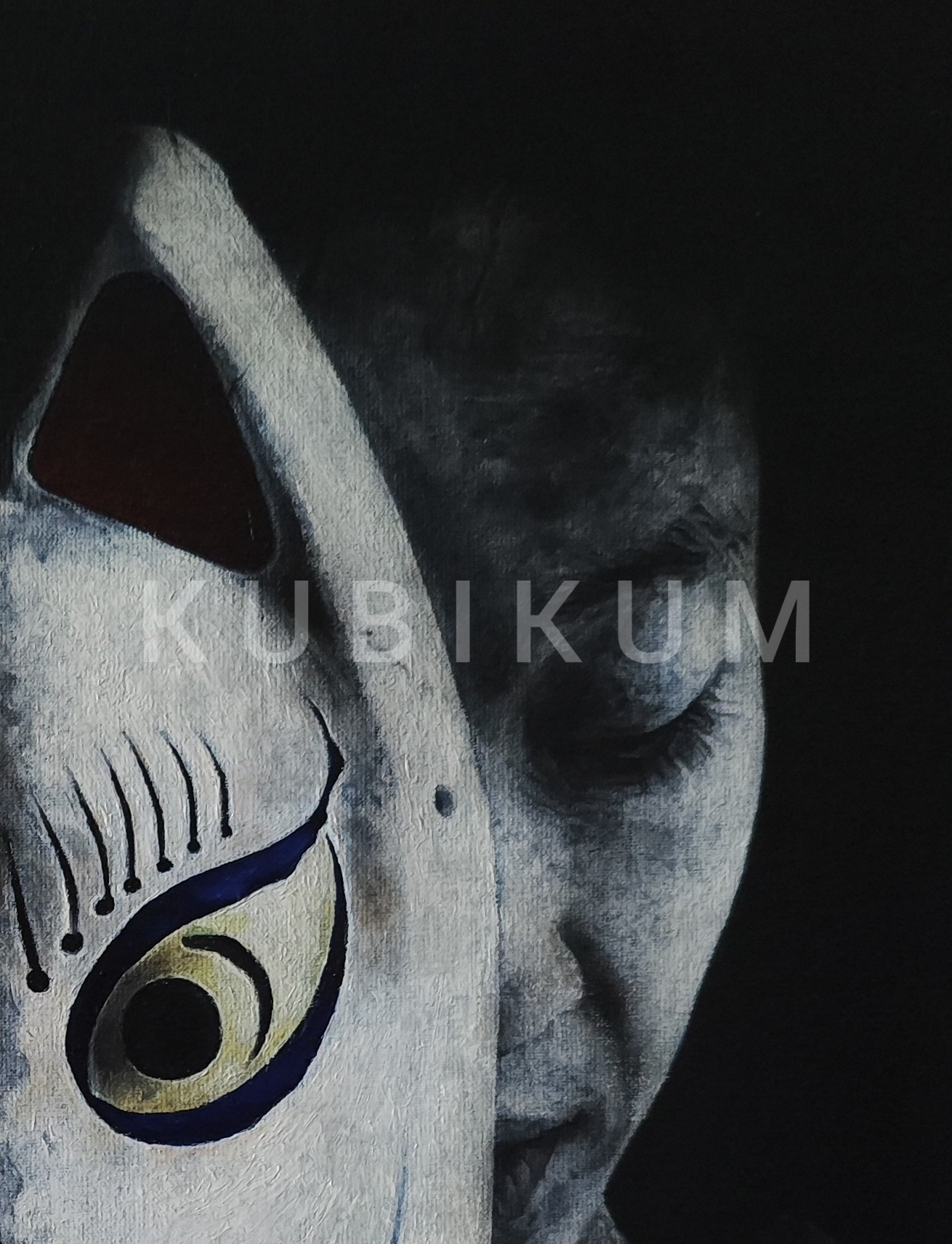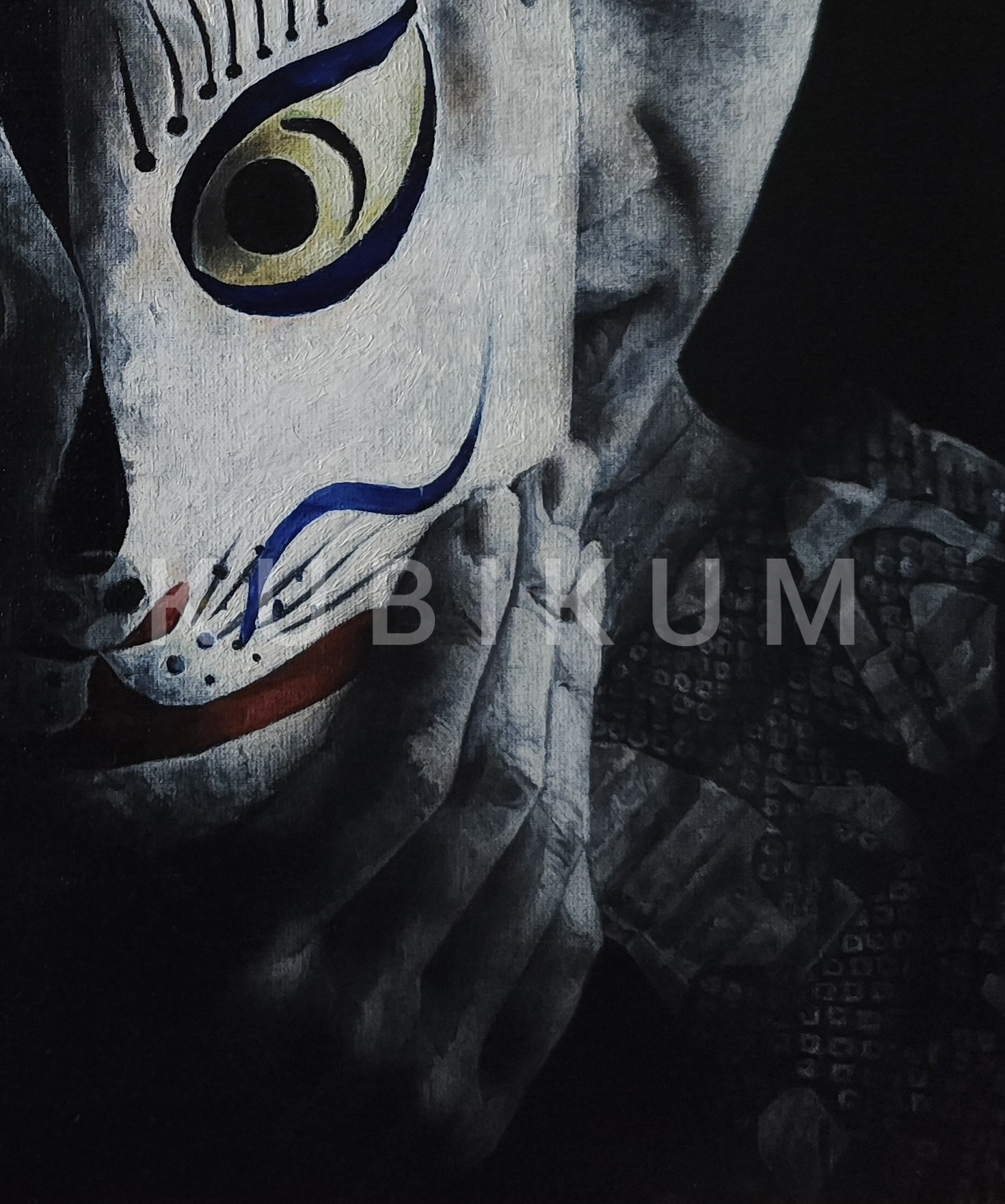 Obraz ma prvý pohľad pôsobí temne a mysticky.V popredí tradičná japonská líščia maska (kitsune maska), ktorá je znázornená veľmi detailne a farebne. Má veľké žlté oko, modré a červené akcenty.Čierne čiary vytvárajú výraznú expresiu. Za maskou je tvár človeka.Kitsune maska je v japonskej kultúre spojená s líškami, ktoré sú považované za mystické bytosti.Popisujú ju ako inteligentného tvora s magickými schopnostami,ktoré sa zvyšujú,vekom a skúsenostami.Medzi ne patrí aj transformácia do ľudskej podoby.Celkovo obraz vyžaruje mystickú a psychologickú hĺbku,ako metafora pre ľudskú identitu a jej vrstvy.Konflikt medzi vonkajším obrazom a vnútorným ja.