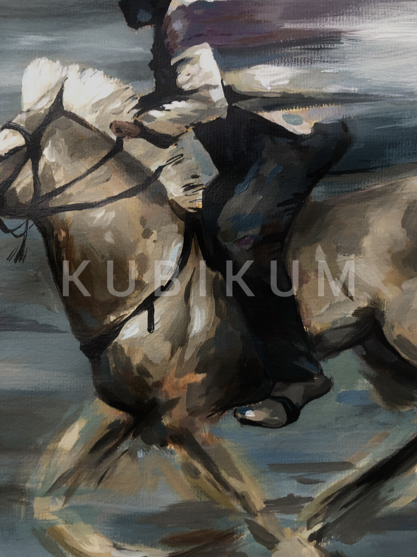 Energia je všetko. Všetko čo si dokážeme predstaviť, vymyslieť, chytiť, urobiť, myšlienky, zvieratá, veci… V mojom obraze ponímanie energie je kôň s jazdcom zachytený v rýchlom behu. Kôň pre mňa predstavuje obrovskú energiu. Zachytený pohyb koňa s jazdcom len umocňuje energiu, zážitok, ktorý ide z maľby.
