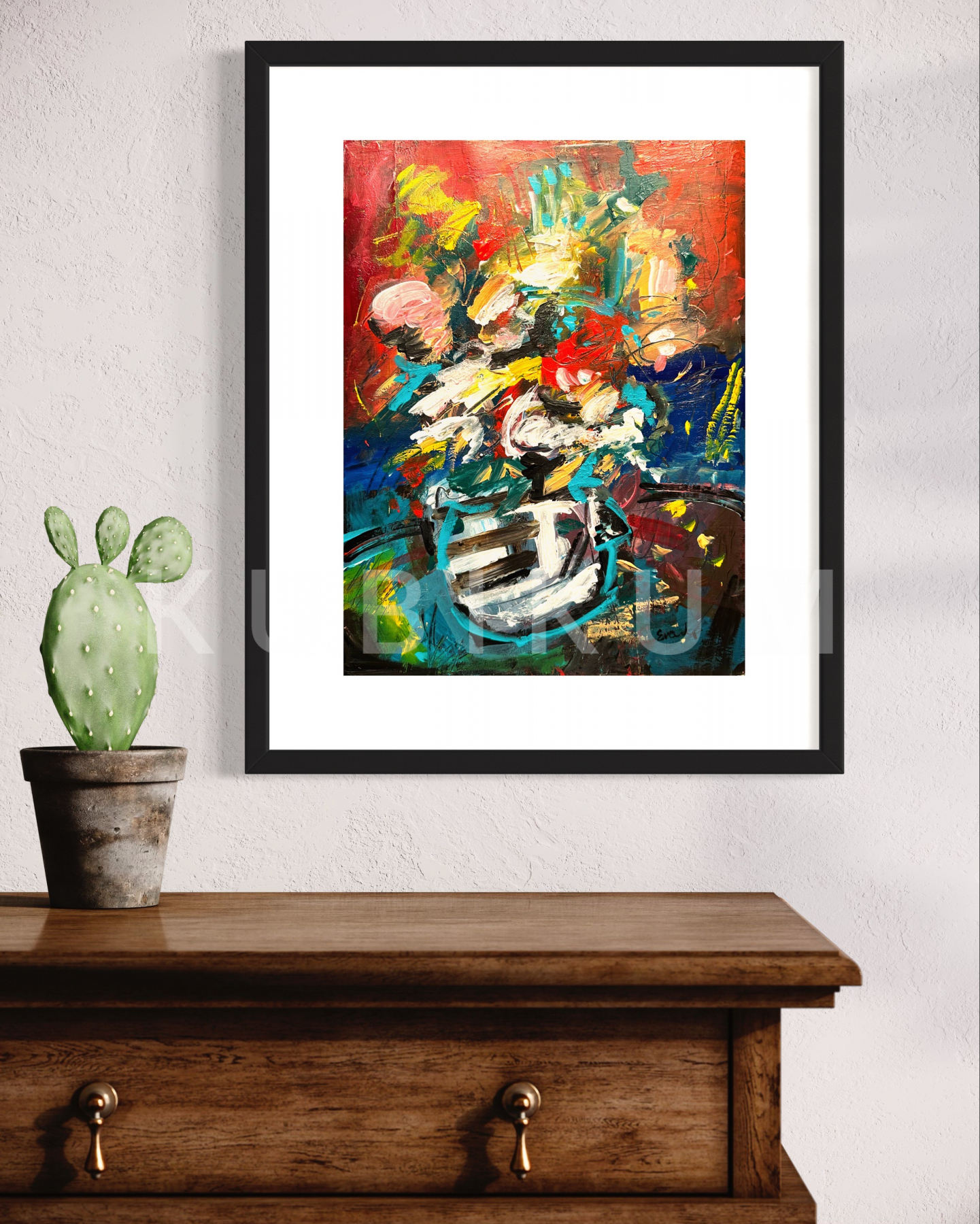 Obraz patrí do setu abstraktných obrazov z mojej tvorby - Kvety. Dielo je originál a maľba je maľovaná akrylom na akrylový papier. Obraz má formát A3. Predávam ho aj s rámom. Celkový rozmer obrazu aj s rámom  je 40cmx50cm.