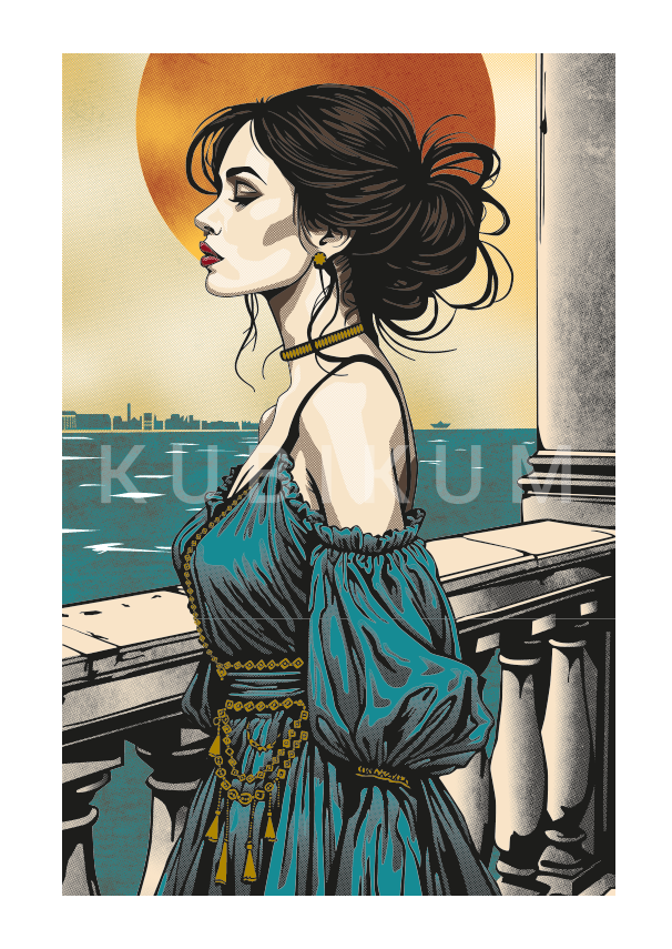 Technicky je dielo vytvorené s mimoriadnou precíznosťou pomocou jemného prekryvu rastrov a plných farebných plôch. Je využitých presne sedem priamych farieb, pričom jedna z nich je špeciálna metalická zlatá – tá bola využitá na zvýraznenie náhrdelníka a náušnice, čím vzniká luxusný a vznešený efekt.