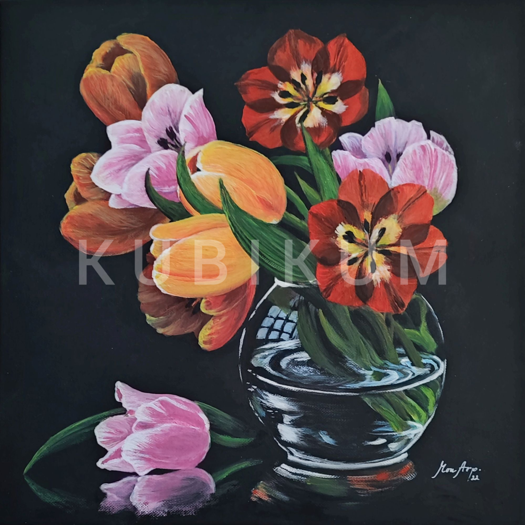 "Obraz predstavuje moderný pohľad na tradičný motív jarných kvetov vo váze. Sýte farby kytice tulipánov v sklenenej váze kontrastujú s čiernym pozadím a vytvárajú vizuálne dynamickú kompozíciu."