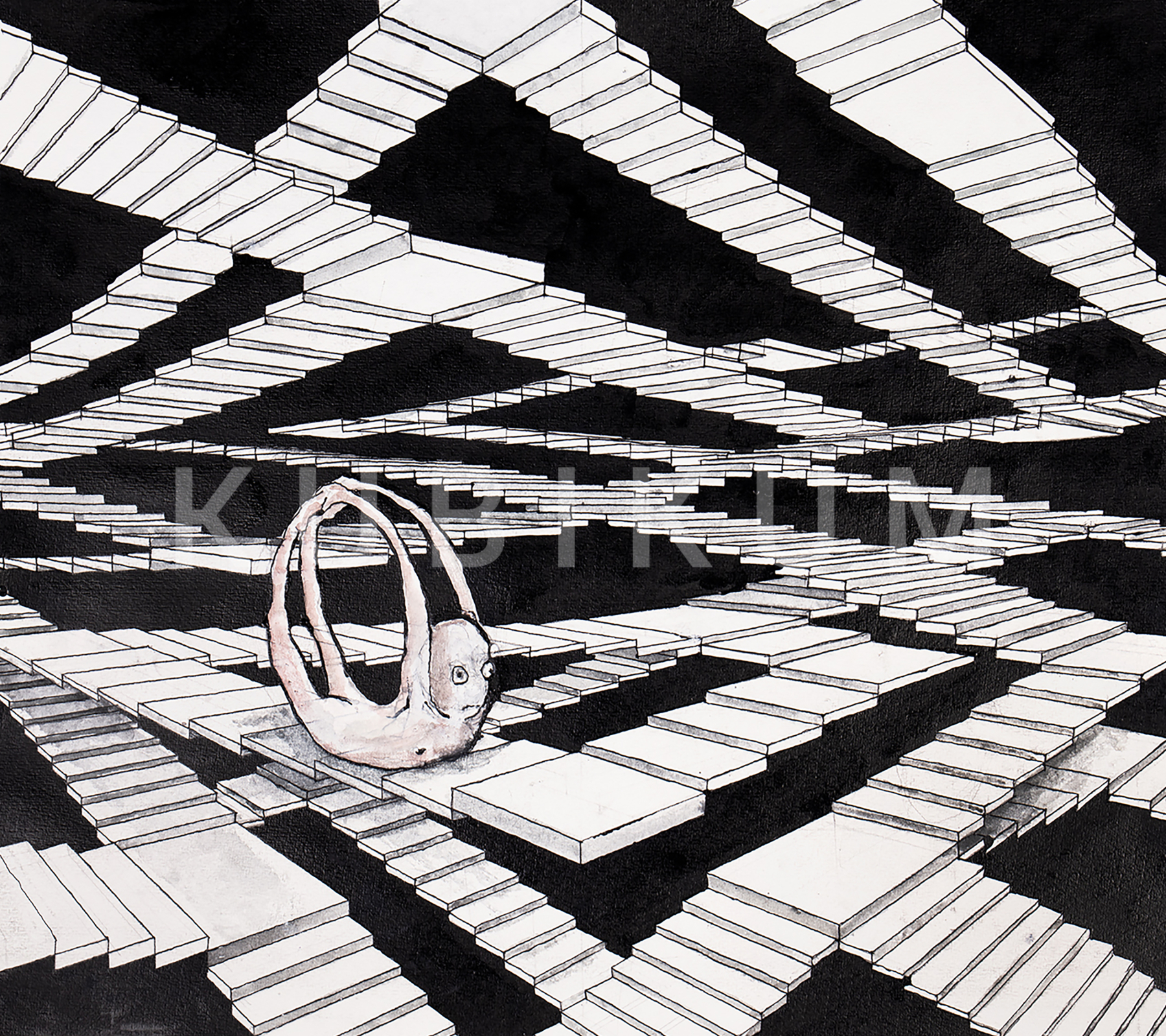 Bludiště, labyrinty, spletité cesty, zdánlivě nekonečná lidská pouť životem. Paradox jako potřeba člověka najít smysl v nesmyslu. Inspirací mi byl nizozemský malíř M. C. Escher a jeho optické iluze. Hlavním prvkem jsou schody, na první pohled spletité a náročné, ale doopravdy nikam nevedoucí. Na nich je člověk, trochu humorně postavený, kutálející se k nějakému svému pomyslnému cíli, kterého vlastně ani nelze dosáhnout.