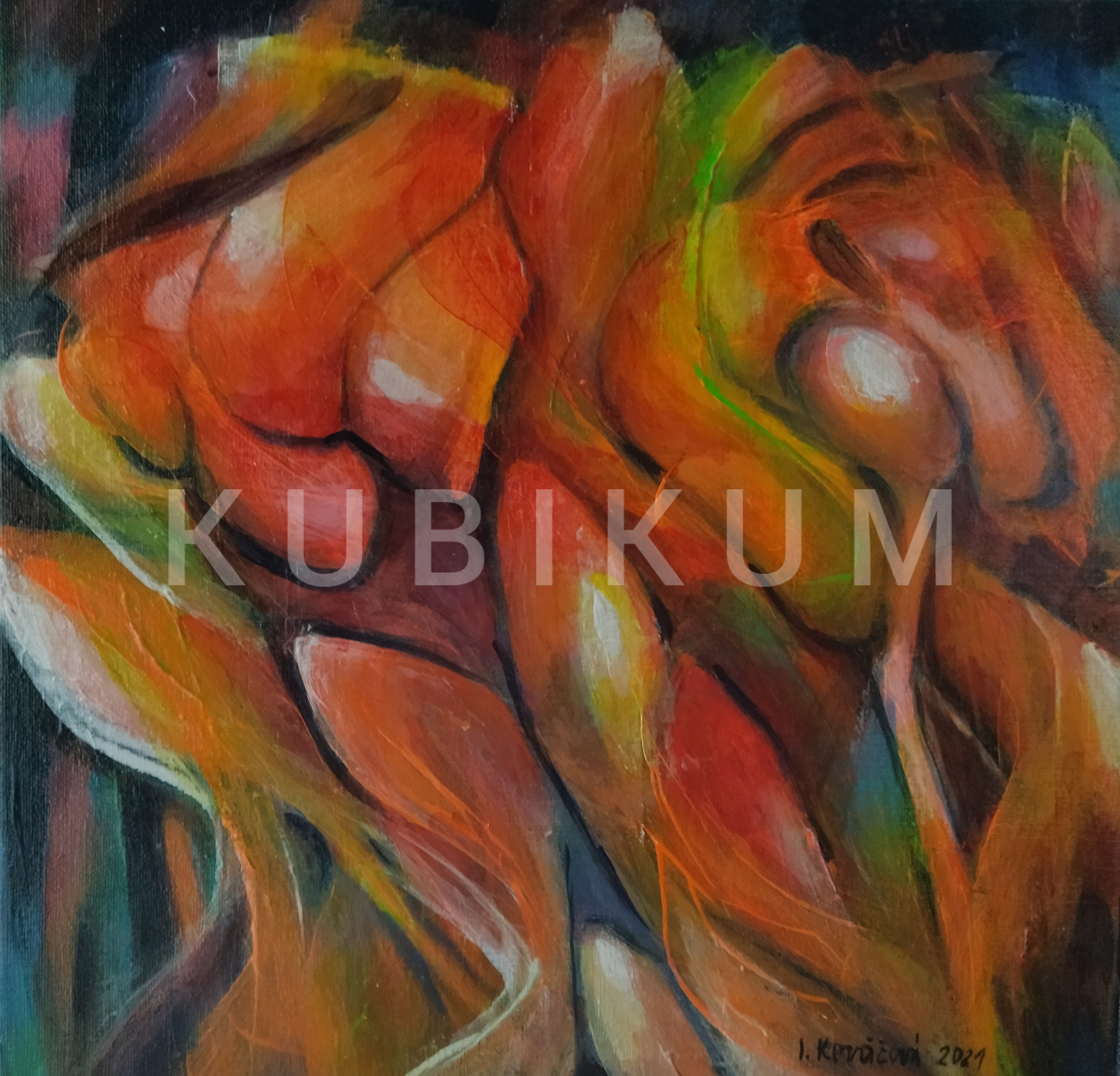 Hra s líniou, prelínanie tvarov, oranžový , maľba na ľanovom plátne