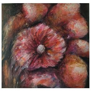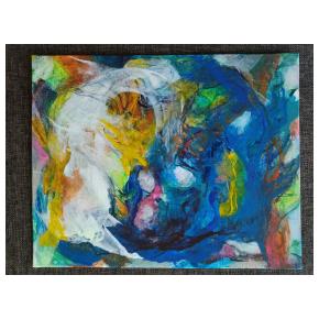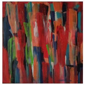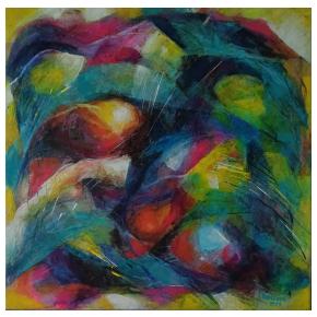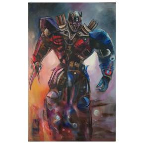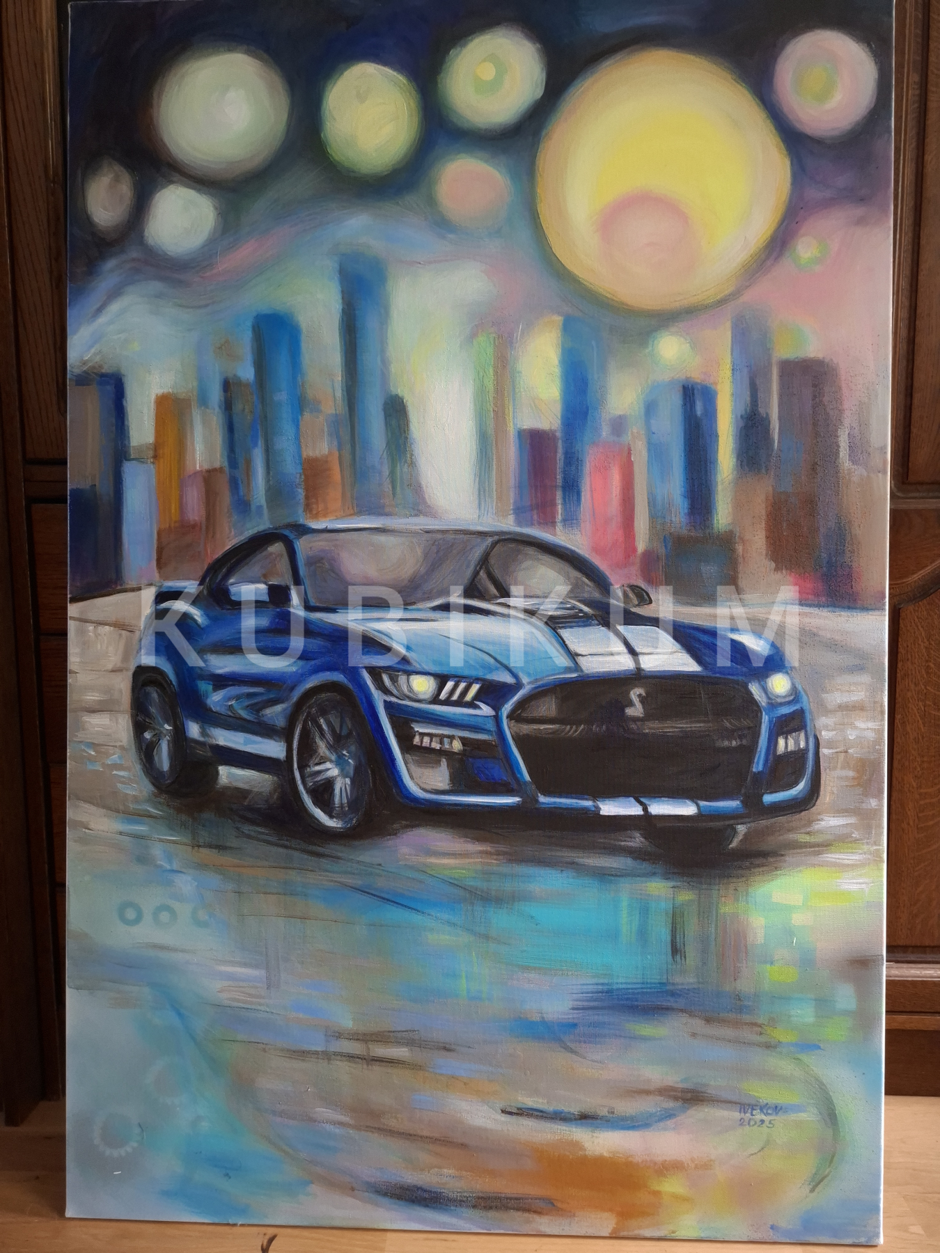 Ford Mustang, námet obrazu, je znázornený v krajine. Krajinu tvoria abstraktné prvky a štylizované mrakodrapy mesta.
