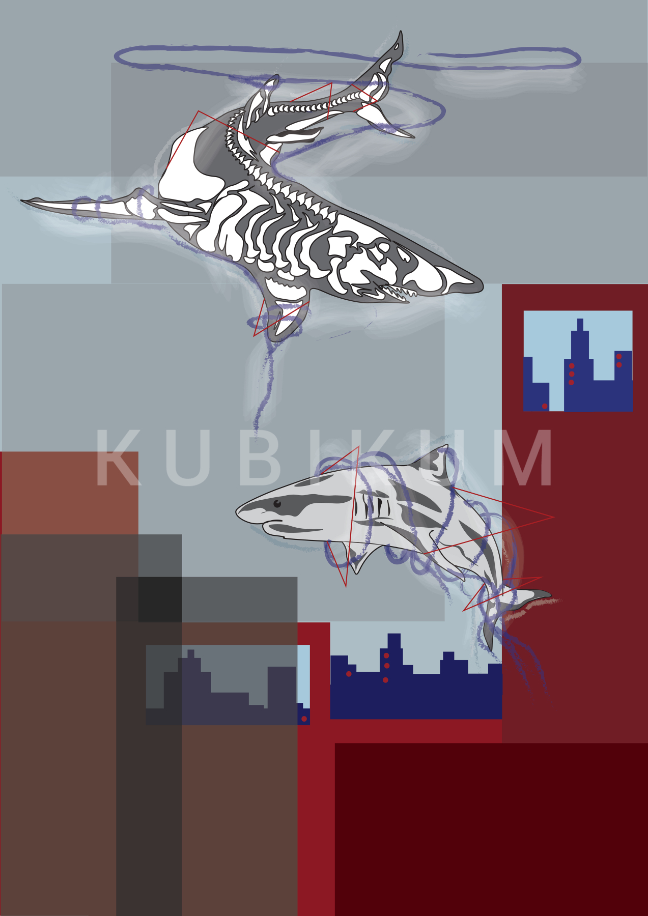 Dielo zobrazuje dva žraloky jeden je živý, plávajúci pri dne nad mestom, a druhý, ktorý je len kostrou, vznášajúci sa v oblakoch. Kostra symbolizuje duchovno ako aj oslobodenie od blížiacej sa budúcnosti a strachu z pokroku.Tento obraz predstavuje budúcnosť, ktorá sa neustále vyvíja, no zároveň v sebe nesie rozpor. Napriek tomu, že žralok žije a napreduje do budúcnosti, niečo ho stále zväzuje a ťahá späť až napokon dosiahne rovnaký osud ako ten nad ním.