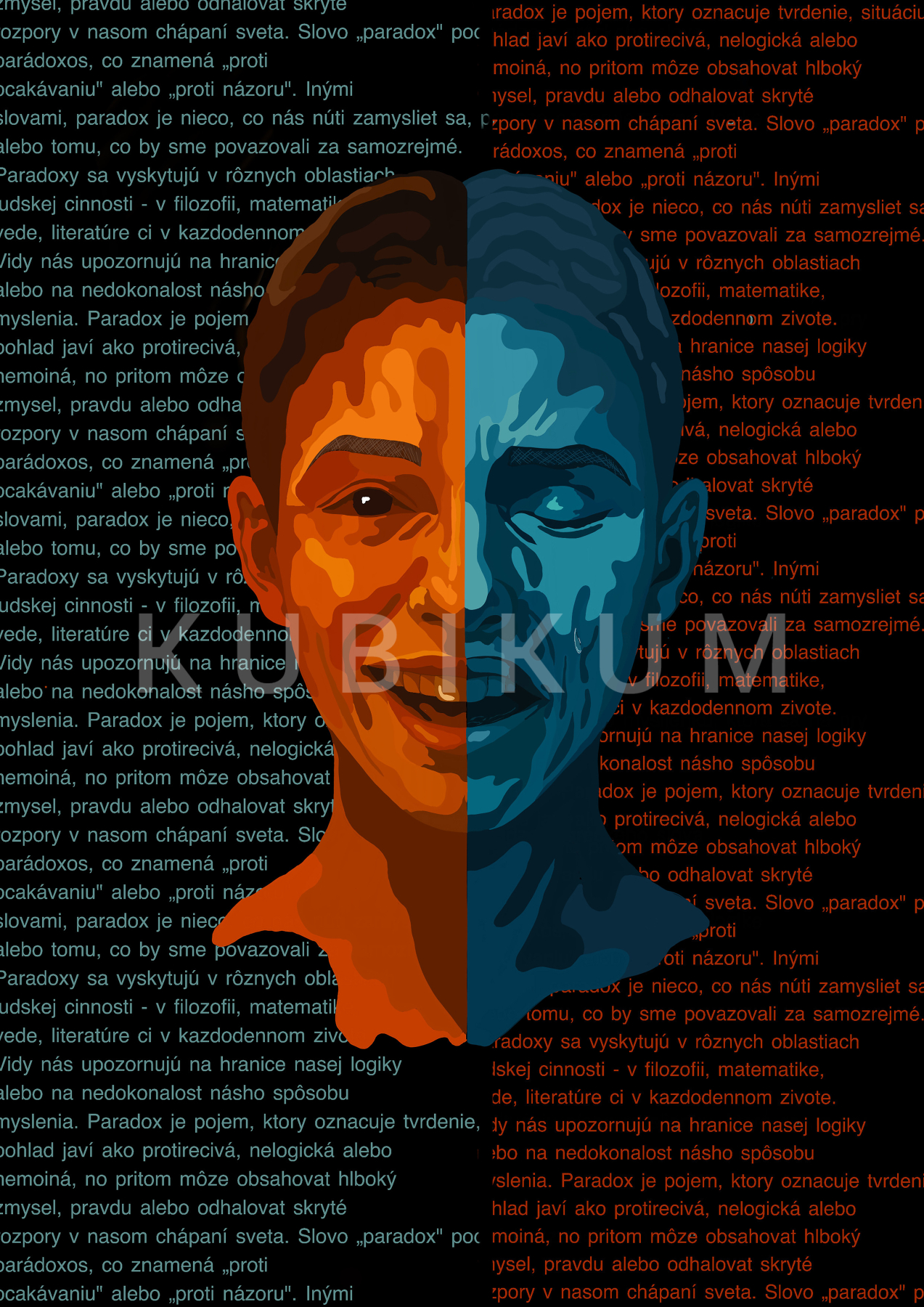 Tvár rozdelená medzi oheň a ľad. Jedna strana sa smeje, druhá plače. Je to paradox emócií – keď sa svetlo mieša s tieňom a úsmev skrýva bolesť. Obraz hovorí o vnútornom boji, o tom, ako dokážeme byť šťastní aj zlomení zároveň. Navonok pokoj, vo vnútri búrka – dve pravdy v jednom človeku.